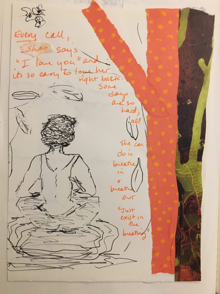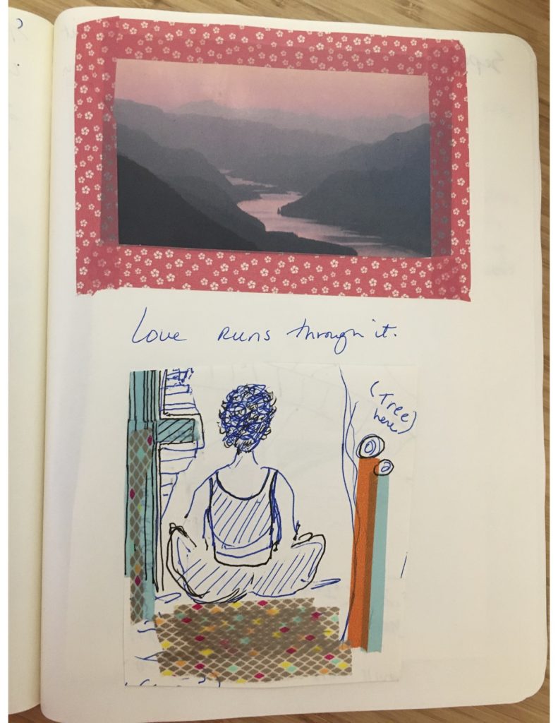 Karen enlisted an artist friend, Beverly Dyer, and together they worked with her Inspiration over the months preceding the gala and, as it turned out her Inspiration’s death. The instant connection Karen felt with her Inspiration had Karen sketching and writing in journals to capture her Inspiration’s insights and wisdom. She filled most of a journal in the months they talked. Her Inspiration was going through intense difficulties and yet often was asking courageous questions such as “How do you find gratitude when you are so very sick?” and “Life has set me some big and impossible terms, so how do I keep enjoying life, while I am still living?” “Love runs through it,” was yet another one of the things Karen would hear when they connected. That and “you can invent a shiny Facebook story that ignores the truth, hides difficulties. Or, you can keep searching to transform things, to shine a light on what’s happened to you.”