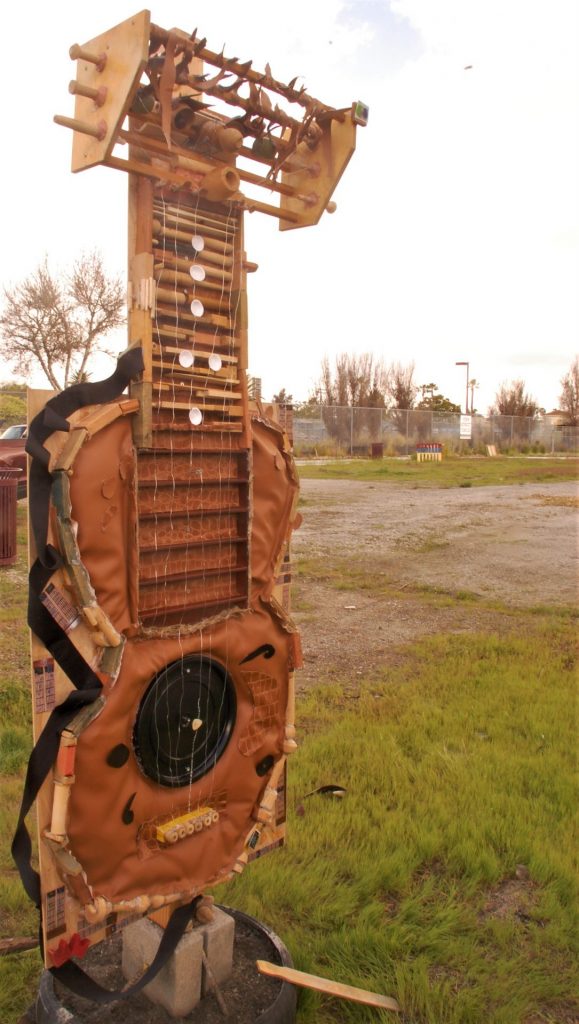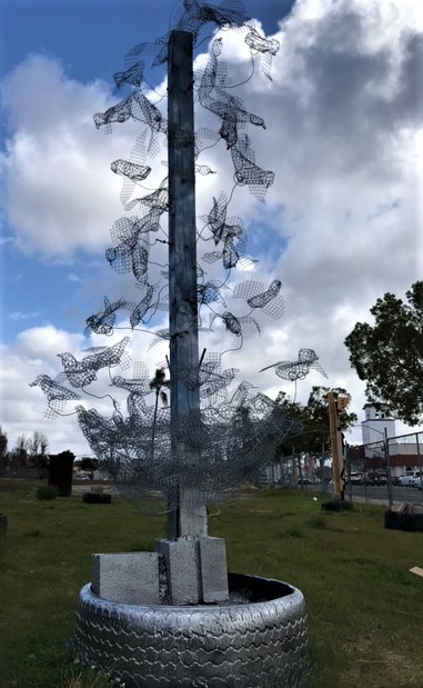 The sculpture is planted in an old tire and filled with three 60 pound bags of cement with two upright bricks. “The variety [is] electric. The characters emerged for each artist’s personal struggle and design. The art became the art.” says Jim.