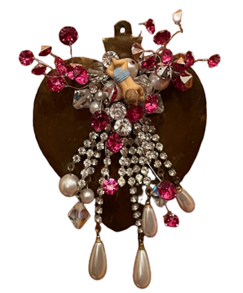 Expanding beyond his mirror art, Vega’s playful, ornate collection of ex-voto rhinestone brooches offers another view of centuries-old symbolism of Milagros confirming faith while “making a deal.” He adds to existing tin-etched heart–clear and colorful rhinestones juxtaposed with Milagros, plastic flowers (no watering needed), finger puppets of monsters, dinosaur heads, and googly eyes–that reflect devotional art symbols and transform them into “fantasy emulates.”
