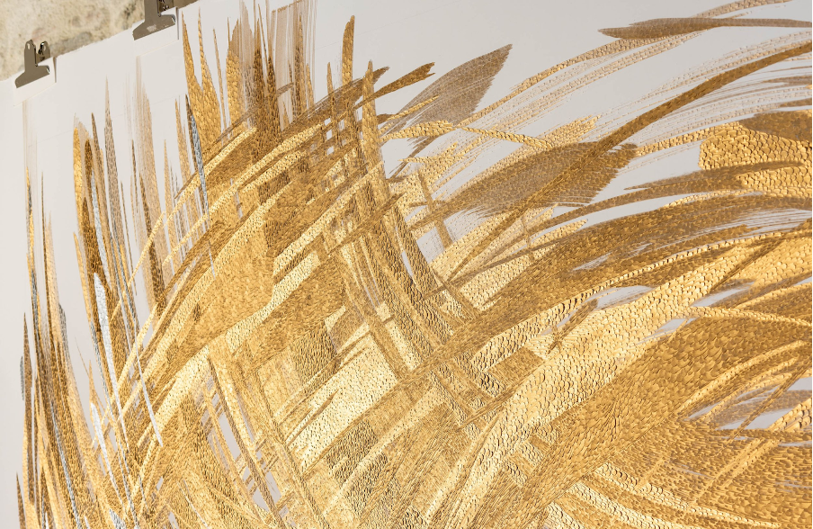 If you’re interested in working with tread in combination with other somewhat random objects, you can refer to the works of Lisa Kokin. Some of her works feature leaves machine-stitched onto paper, bound by the canvas. Her most recent works are quite abstract. She tends to stitch her art onto a canvas of fabric, sometimes adding other materials.