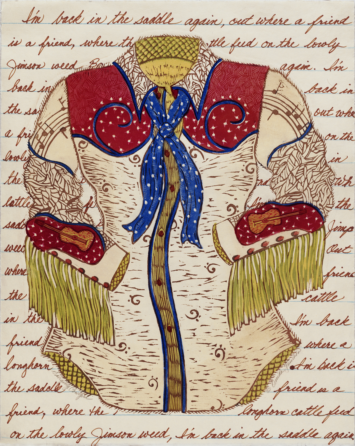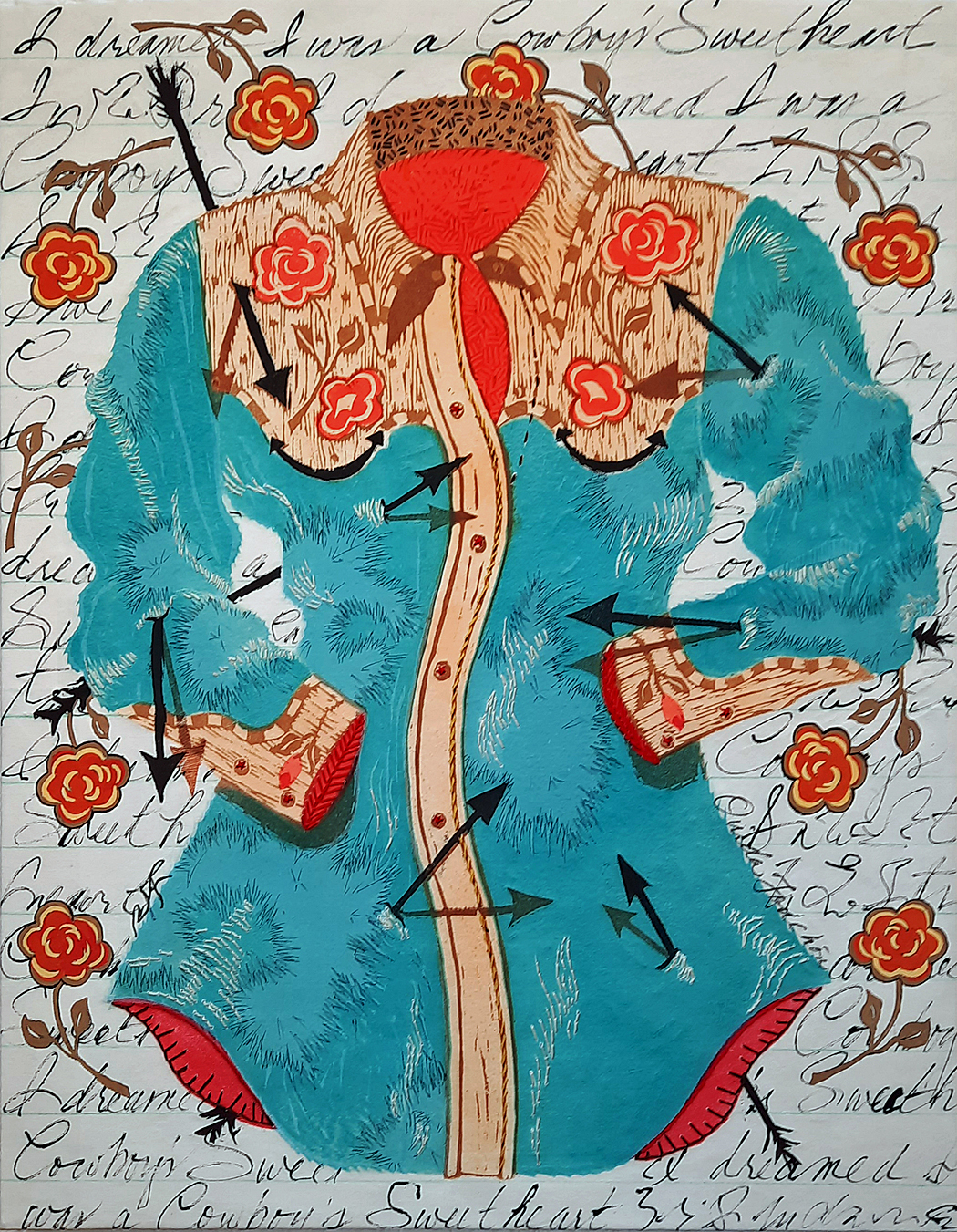 A: I enjoy working in the studio on various media including printmaking and painting as well as collage. I am drawn to historic female characters; strong women and what I imagine that they would wear.