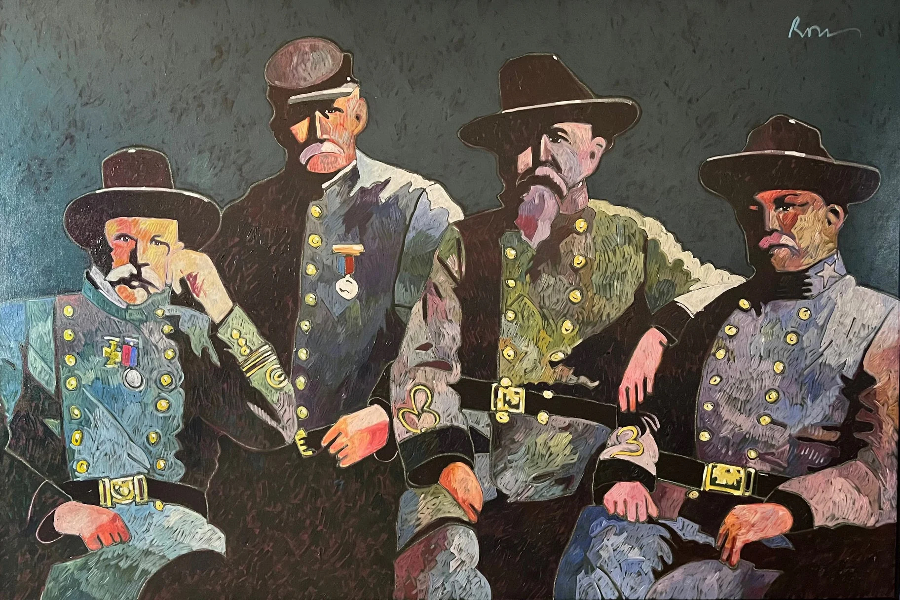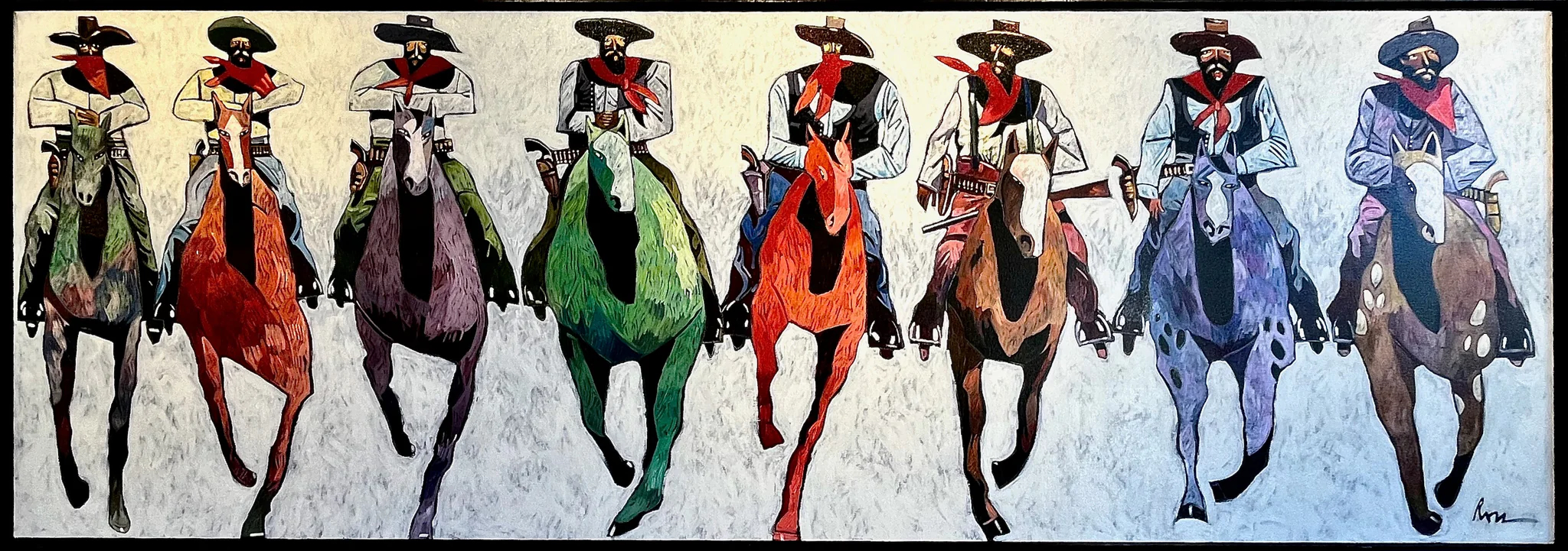 In his recent work “The Posse,” an original 60×60 acrylic painting, Ross reveals the theatrical nature of Western mythology. “This one came to me in a dream,” he explains. “Four lawmen, led by Pat Garrett, riding at midnight under the stars.” The piece features actual wooden stars attached to the canvas, representing both the officers’ badges and the night sky. “The stars in the sky are intended to reinforce the idea that this is a theatrical production…the story is being danced out on a stage with all the props.”