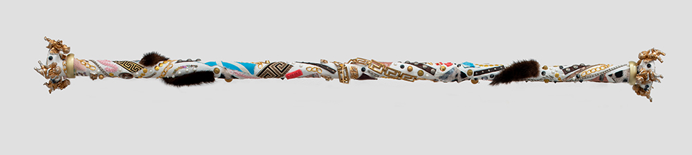 In the past, horror vacui, or the fear of emptiness, was often employed in art and was considered sacred and highly regarded. Today, minimalism represents refinement and luxury while maximalism is unrefined and cheap. Ryals’ Rugs series highlights the casino floor, the detrital glory of belongings lost, and gambling paraphernalia hidden. The selection of collage materials is informed by the classic iconography of Las Vegas, such as spas, pools, steakhouses, buffets, hotel lobbies, casino floors, and wedding chapels. Ryals incorporates poker chips, playing cards, bra straps, peacock feathers and much more into the shape of a seventeenth century Savonnerie French rug pattern. The resulting image is photographed with a high-resolution camera and printed mechanically onto a velvet rug. What many would consider trash, is transformed to create the illusion of luxury. The rugs reference what is, in today’s fast fashion world, considered unattainable, the opulence of a hand-crafted, hand-woven textile wall hanging or rug.