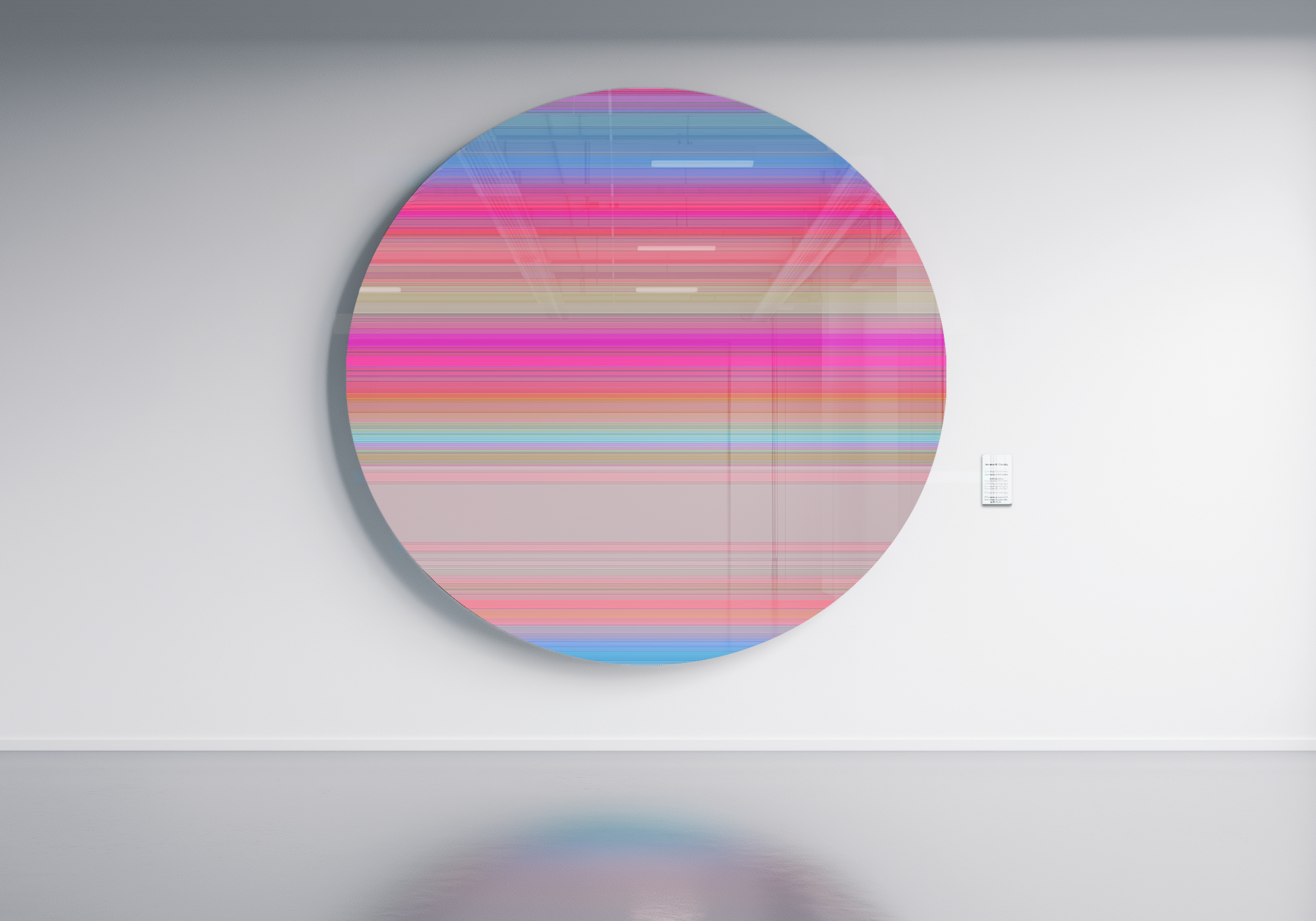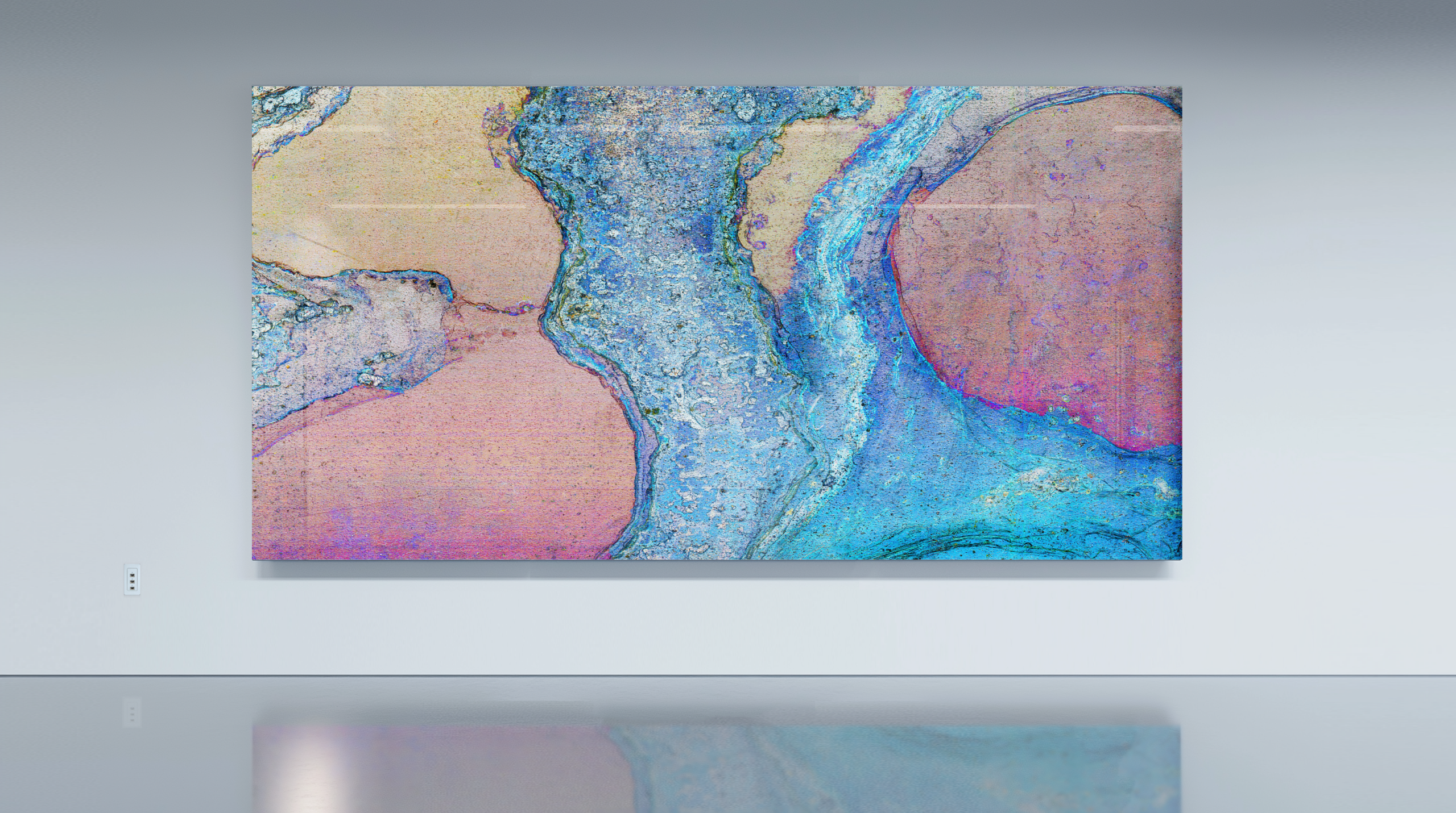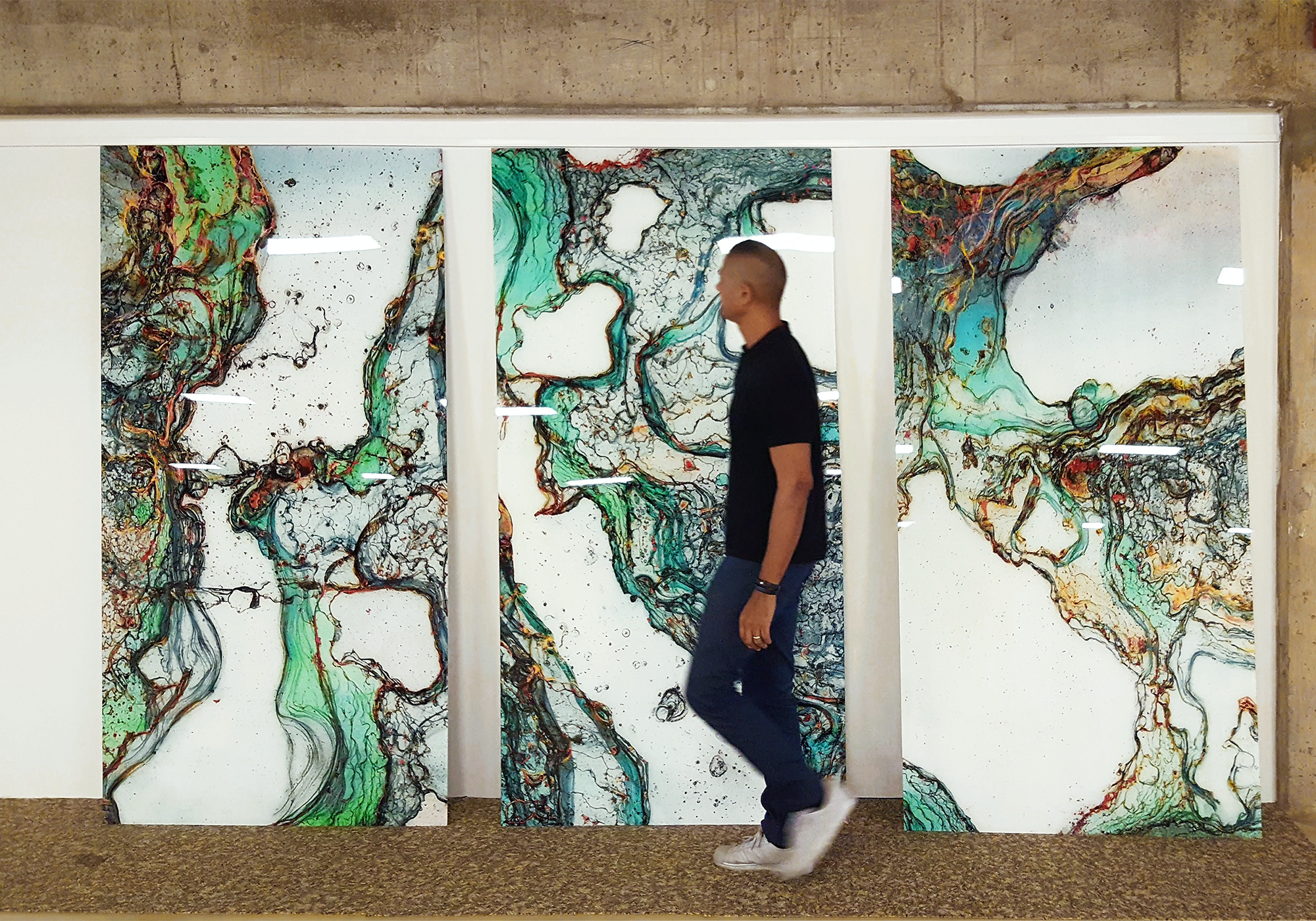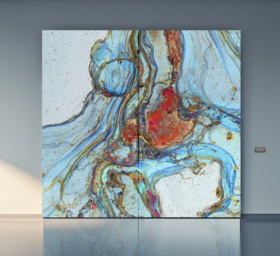 In parallel with Ferrophoto, Crane developed Signal, a companion body of work derived from microscopic fragments of Ferrophoto surfaces. Where Ferrophoto emphasizes organic complexity and material volatility, Signal isolates moments of structure and clarity, digitally enlarging them into large-scale compositions on glass. The resulting works retain their metallurgical origin while offering a more distilled visual language, making them well- suited to architectural corridors, transitional spaces, and environments where focus and calm are essential.